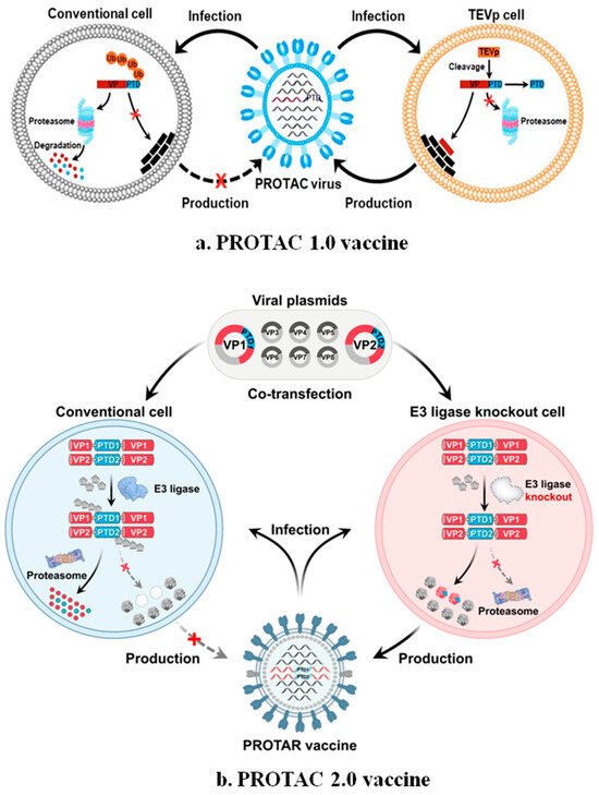 Recently, Si et al. described a novel PROTAC-based vaccine technology. They utilized PROTAC technology to attenuate the influenza virus by leveraging the host proteasomal degradation pathway. The attenuated strain of the influenza virus (PROTAC virus) was created by attaching a proteasome-targeting domain (PTD) to viral structural or non-structural proteins. The PROTAC viruses were generated by linking the PTD to target proteins. To regulate the replication of the PROTAC virus in cell lines, the PTD peptide was connected to the target protein through a tobacco etch virus (TEV) protease-sensitive site (ENLYFQG). The TEV protease-expressing cell lines prevent the proteolysis of the PTD-tagged target proteins. Consequently, the PROTAC virus replicates in cell lines that stably express TEV protease, producing the PROTAC virus strains for vaccine production [54].