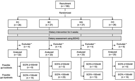 | Item | PC (Gut Dysbiosis) (n = 14) | BC (Gut Dysbiosis) (n = 23) | GG (Gut Dysbiosis) (n = 13) | CO (Gut Dysbiosis) (n = 14) | ||||