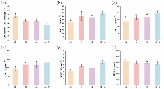 Under saline-alkaline stress conditions, plants activate their antioxidant enzyme systems to scavenge excess reactive oxygen species (ROS), thereby mitigating oxidative damage to cellular components. Our results demonstrate that microbial inoculation treatments significantly enhanced the activities of key antioxidant enzymes (POD, SOD, APX, and CAT) in rice leaves (Figure 1b–e). Notably, the A2 + M dual-inoculation treatment exhibited the most pronounced stimulatory effects, with POD, SOD, APX, and CAT activities increased by 47.95%, 48.06%, 46.46%, and 67.68%, respectively, compared to CK (Table S2). Corresponding analysis of oxidative stress markers revealed that the A2 + M treatment significantly reduced H2O2 and MDA contents by 36.93% and 13.18%, respectively, relative to CK (Figure 1a,f; Table S2). These findings align well with the observed upregulation of antioxidant enzyme activities, suggesting that the A2 + M treatment effectively strengthens the rice antioxidant defense system, thereby alleviating saline–alkaline stress-induced oxidative damage.