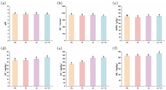 Soil pH was measured using a pH meter (FE28, METTLER-TOLEDO, Columbus, OH, USA) at a soil-to-water ratio of 1:2.5 (m/v). Soil electrical conductivity (EC) was determined using a conductivity meter (Bante902P, Bante, China) at a soil-to-water ratio of 1:5 (m/v) [3]. Soil Organic Matter (SOM) was determined using the potassium dichromate oxidation-external heating method [38]. Alkali-hydrolyzable nitrogen was measured by the alkaline hydrolysis diffusion method [39]. Available phosphorus was extracted with sodium bicarbonate (NaHCO3) and quantified by molybdenum-antimony anti-spectrophotometry [40]. Exchangeable potassium was extracted with ammonium acetate (NH4OAc) and measured using flame photometry [41]. All analyses were performed with three biological replicates to ensure data accuracy and reliability.