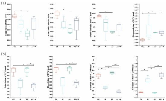 Microbial community α-diversity was assessed using Sobs, Chao1, Simpson, and Shannon indices. For bacterial communities (Figure 3a), A2 single inoculation significantly reduced both diversity and richness compared to CK (p < 0.05), while other treatments showed no significant differences. Regarding fungal communities (Figure 3b), A2 + M co-inoculation significantly decreased richness and diversity versus CK (p < 0.05). Additionally, M single inoculation significantly reduced fungal richness indices (Sobs and Chao1; p < 0.05). Principal coordinates analysis (PCoA) based on Bray Curtis distances revealed distinct microbial community structures among treatments (Figure 4a,b). For bacterial communities, PC1 and PC2 explained 35.34% and 15.33% of the variation, respectively. Fungal community variation was primarily explained by PC1 (72.27%) and PC2 (11.31%). Significant separation (p < 0.01) was observed among all treatments (CK, M, A2, and A2 + M), indicating pronounced differences in rhizosphere microbial composition.