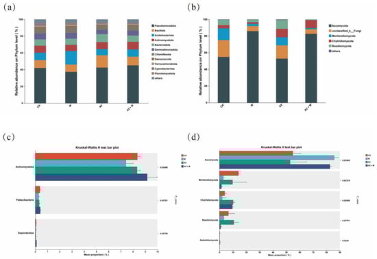 The bacterial communities were dominated by 11 phyla with relative abundance >1%, including Pseudomonadota, Bacillota, Acidobacteriota, Actinomycetota, Bacteroidota, Gemmatimonadota, Chloroflexota, Deinococcota, Verrucomicrobiota, Cyanobacteriota, and Planctomycetota, which collectively accounted for >95% of total bacterial sequences (Figure 5a). For fungal communities, five phyla showed relative abundance >1%: Ascomycota (>50% across all treatments), unclassified_k__Fungi, Mortierellomycota, Chytridiomycota, and Basidiomycota (Figure 5b). The Kruskal Wallis H test revealed significant differences in phylum-level composition among treatments (Figure 5c,d). Compared with CK, the dual inoculation treatment (A2 + M) significantly increased the relative abundances of Actinomycetota, Patescibacteria, Dependentiae, Ascomycota, and Chytridiomycota, while decreasing Mortierellomycota and Basidiomycota (p < 0.05). These results indicate that microbial inoculation can significantly alter the relative abundances of dominant phyla in the microbial communities.
