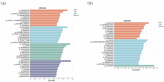 Identification of characteristic dominant microbial genera in different saline–alkali soil treatments using LEfSe analysis. (a) Bacterial communities. (b) Fungal communities.