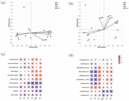 Distance-based redundancy analysis (db-RDA) and correlation heatmap analysis revealed significant associations between environmental factors and microbial communities (Figure 7). The db-RDA explained 45.76% and 64.82% of the total variance for bacterial and fungal communities, respectively, confirming the reliability of the analysis. The addition of microbial inoculants significantly altered soil microbial community structure. In bacterial communities, only Actinomycetota showed significant positive correlations with soil nutrients (SOM, AP, AN, and AK; p < 0.05), which was consistent with the trends observed in the A2 + M treatment. For fungal communities, SOM, AN, and AP were positively correlated with Chytridiomycota (p < 0.05), while pH and EC were positively associated with Mortierellomycota, Aphelidiomycota, unclassified_k__Fungi, and Basidiomycota. These results demonstrate that environmental factors differentially influence fungal and bacterial communities.