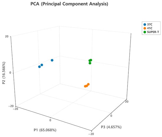 First, principal component analysis (PCA) was conducted to assess transcriptomic variation across the three conditions. The PCA plot revealed a clear separation between the 37 °C control group and the 41 °C heat-stressed group. This distinction revealed an alteration in gene expression induced by thermal stress. Notably, the SUPER-T-treated group showed distinct differences in both the heat-stressed and the control group, suggesting that postbiotics intervention regulated the heat-induced transcriptional changes in a unique way (Figure 1).