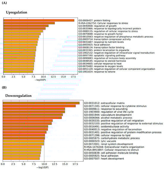 Gene ontology analysis of top 20 (A) upregulated and (B) downregulated pathways by thermal stress. Compared to the 37 °C group, the 41 °C group had increased protein folding and cellular responses to stress. In addition, the 41 °C group showed decreased gene expression related to the extracellular matrix.