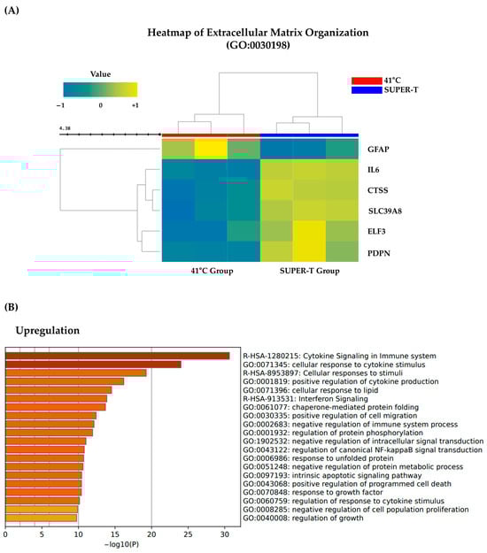 Alterations in extracellular matrix organization (ECM)-related genes by SUPER-T. (A) Genes involved in ECM repair and remodeling, such as IL-6, PDPN, and CTSS, were upregulated by SUPER-T treatment. (B) Gene ontology analysis of SUPTER-T group in comparison to 41 °C group. SUPER-T was involved in ECM remodeling by upregulating cytokine signaling and cellular response to cytokine stimulus-related genes.