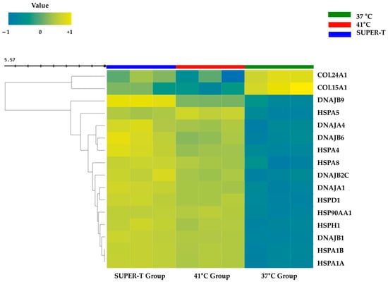 Relative heat shock protein (HSP) and collagen mRNA expression between the three groups. The effect of thermal stress and SUPER-T on the expression of heat shock proteins (HSPs) and collagen-related genes. The expression of HSPs increased at 41 °C compared to 37 °C, and SUPER-T relatively increased the expression of collagen-related genes that were significantly reduced by thermal stress.
