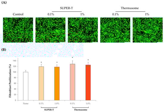 For the Cell-Counting Kit-8 assay, 10,000 cells of Hs68 per well of a 96-well plate (Corning, Singapore, #3595) were seeded and incubated for 24 h. The 0.1% and 1% of SUPER-T and Thermasome were treated with 100 μL of DMEM supplemented with 1% AA. After 24 h of incubation, the old medium was removed, and cells were washed with 100 μL of DPBS. Cells were then provided with 100 μL of 10% CCK-8 solution (Dojindo, Rockville, MD, USA, #CK04-13) in DMEM supplemented with 1% AA and incubated for 2 h in the dark. The supernatant was placed into a new 96-well plate to avoid noise when measuring absorbance. The absorbance was measured at 450 nm with a multimode plate reader (PerkinElmer, Singapore, #VICTOR X3). The cell proliferation rate was calculated as follows: