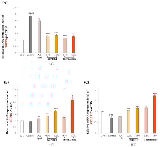 A transient receptor potential vanilloid 1 (TRPV1) is a heat-sensitive ion channel associated with nociceptive signaling and inflammation []. The result showed that the TRPV1 marker on keratinocytes was activated when cultured at a high temperature, 41 °C (Figure 6A). When cells were exposed at the same temperature but treated with SUPER-T and Thermasome, the gene expression of TRPV1 downregulated, suggesting a potential soothing effect against heat stress. Both materials at concentrations of 0.1% and 1% significantly downregulated TRPV1 expression. Moreover, their effects on fibroblasts were measured to examine the expressions of markers associated with basement membrane components, structural ECM, and specialized ECM-associated proteins.