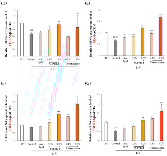 Analysis on gene expressions in HaCaT and Hs68 with 0.1% and 1% of SUPER-T and Thermasome by RT-qPCR. Relative mRNA expression levels of (A) TRPV1, (B) NID1, (C) COL6A1, (D) COL1A1, (E) FBN, (F) COL15A1, and (G) COL24A1 normalized to the expression level of β-actin were analyzed. We used 1 μM of ascorbic acid as a positive control. ##, ###, and #### indicate ## p < 0.01, ### p < 0.001, #### p < 0.0001 vs. 37 °C. *, **, ***, and **** indicate * p < 0.05, ** p < 0.01, *** p < 0.001, **** p < 0.0001 vs. control.