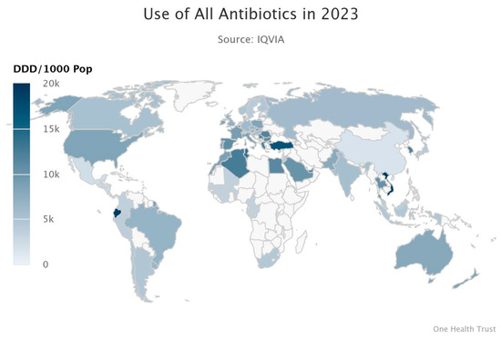 - OneHealthTrust. ResistanceMap: Antibiotic Use. 2023. Available online: https://resistancemap.onehealthtrust.org/AntibioticUse.php (accessed on 6 May 2025).