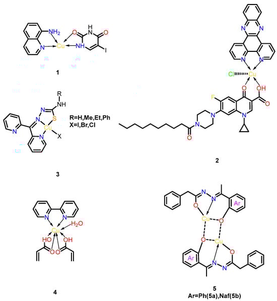 Structural series of copper complexes. (1) 8-aminoquinoline-5-nitrouracil-copper; (2) Cu-DPPZ-CipA; (3) [Cu(N,N,S-py2tsc-N1HR2)X] (X = I, Cl, Br); (4) [Cu(2,2-bipy)2(C3H3O2)6(H2O)]; (5) Cu(II)(N′-(1-(2-oxyphenyl) ethylidene)-2-phenylacetohydrazide) 5a and Cu(II)(N′-((1-oxyna- phthalen-2-yl) methylene)-2-phenylacetohydrazide) 5b.