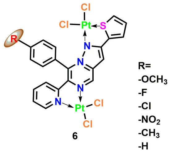 Coordination structure of the binuclear Pt(II) complex [Pt2(μ-Cl)2(L-R)Cl2], where L-R is a tetradentate pyrazolo [1,5-a] pyrimidine ligand with variable substituent R at the para-position of the C-8 phenyl ring (R = -OCH3, -F, -Cl, -NO2, -CH3, -H) Complex 6 [26].