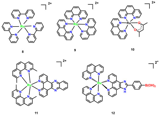 Mononuclear polypyridylruthenium (II) complexes exhibiting antimicrobial activity. (8) [Ru(bpy)3]2+; (9) [Ru(phen)3]2+; (10) [Ru(phen)2(acac)]+; (11) [Ru(2,9-Me2phen)2 (dppz)]2+; and (12) [Ru(phen)2(p-BPIP)]2+ [42].