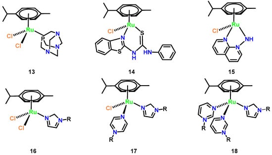 Chemical structures of representative half-sandwich ruthenium(II) arene (Complexes 13–18). (13) [Ru(η6-p-cymene)Cl2(pta)]; (14) [Ru(η6-p-cymene)Cl2 (Lbenz)]; (15) [Ru(η6-p-cymene)Cl(1,8-naphthyridin-1-amine)]; (16) [Ru(η6-p-cymene)Cl2 (imidazole-R)]; (17) [Ru(η6-p-cymene)Cl(pyrazine-R)(imidazole-R)]; and (18) [Ru(η6-p-cymene) (pyrimidine-R)2(imidazole-R)].