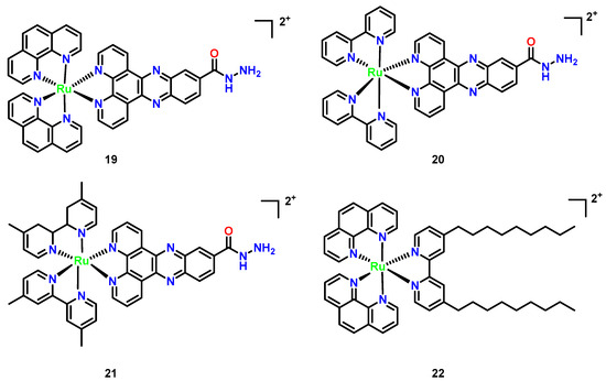 Chemical structures of octahedral polypyridyl (Complexes 19–22). (19) [(phen)2Ru(dppz-carbohydrazide)]2+; (20) [(bpy)2Ru(dppz-carbohydrazide)]2+; (21) [(Me2bpy)2Ru(dppz-carbohydrazide)]2+; and (22) [(phen)2Ru(bpy-dinonyl)2]2+.