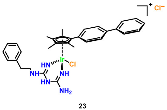While reports on the antimicrobial activity of organometallic iridium(III) complexes remain limited, key studies highlight their unique mechanisms and therapeutic potential. Keene and Collins (2013) pioneered comparative analyses of Ru(II) and Ir(III) complexes, revealing that Ir(III) derivatives (overall charge +4 post-aquation) exhibit bacteriostatic rather than bactericidal effects against Gram-positive and Gram-negative bacteria [43]. This reduced efficacy was attributed to hindered membrane penetration due to higher charge density and the lability of chloride counterions, which impair bacterial accumulation. However, subsequent work on cyclometalated Ir(III)-polypyridyl complexes demonstrated their ability to interact with DNA via intercalation or act as photosensitizers, generating reactive oxygen species (ROS) under light irradiation to induce oxidative damage [47]. A landmark example is ([Ir(Cp*)(biguanide) Cl]+ (Cp* = pentamethy lcyclopentadienyl; biguanide = metformin derivative) (Figure 10, Complex 23), developed by Chen et al. The complex showed broad-spectrum efficacy with MICs of 0.125 μg/mL against MRSA (4× more potent than vancomycin) and 0.25 μg/mL against C. albicans and C. neoformans (32× superior to fluconazole), while synergistically restoring vancomycin activity against resistant Enterococci and disrupting > 70% of S. aureus biofilms at sub-MIC levels, though limited against Pseudomonas aeruginosa (MIC > 32 μg/mL) due to efflux-mediated resistance [47].