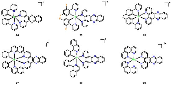 Chemical structures of polypyridyl iridium(III) complexes (Complexes 24–28). (24) [(phenylpyridine)2Ir(dppz)]+; (25) [(difluorophenyl-pyridine)2Ir(dppz)]+; (26) [(ptpy)2Ir(dppz)]+; (27) [(phenylquinoline)2Ir(dppz)]+; (28) [(phenylisoquinoline)2 Ir(dppz)]+; and ruthenium complex (29) [Ru(phen)2(dppz)]2+.