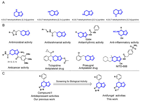 The structures of 4,5,6,7-tetrahydrothienopyridines. (A) the common structures of four representative 4,5,6,7-tetrahydrothienopyridines; (B) the structures of representative 4,5,6,7-tetrahydrothienopyridines with biological activity; (C) the design of target compound.