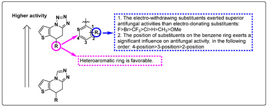 Furthermore, a comparative analysis of the antifungal activities against R. solani between target compound series I and II, which share an identical R group, revealed that series compound I generally exhibited superior antifungal efficacy compared to its corresponding series compound II. For instance, compounds I-7, I-14, I-15, I-16, and I-17 demonstrated antifungal efficacies of 80%, 41%, 62%, 59%, and 22% against R. solani, respectively, whereas their corresponding compounds II-4, II-1, II-2, II-3, and II-5 showed inhibition rates of 32%, 26%, 31%, 37%, and 10% against R. solani, respectively. These results indicate that compounds with a 4,5-dihydrotetrazolo [1,5-a]thieno [2,3-e]pyridine scaffold possess enhanced antifungal activity relative to those with a 4,5-dihydrothieno [2,3-e] [1,2,4]triazolo [4,3-a]pyridine scaffold. Overall, these SAR analysis results provide valuable insights for guiding the design of compounds with improved antifungal activity. The summarized SAR analysis was shown in Figure 2.