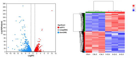 Transcriptome analysis of R. solani treated by I-12. (Left) Volcano plots. (Right) Heatmap.