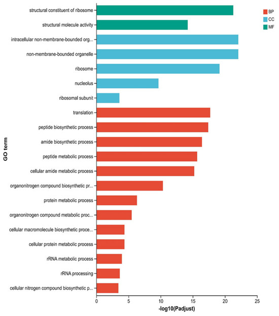 To preliminarily investigate the antifungal mechanism of target compounds, compound I-12 was selected as a representative to explore its molecular mode of action at the gene expression level using transcriptome sequencing technology. Based on the quantitative analysis of R. solani expression levels following treatment with I-12, an inter-group differential gene expression analysis was conducted. The volcano plots and heatmap for these DEGs are presented in Figure 3. A total of 1757 differentially expressed genes (DEGs) were identified, of which 811 were significantly up-regulated and 946 were significantly down-regulated. Subsequently, these DEGs were used for Gene Ontology (GO) and Kyoto Encyclopedia of Genes and Genomes (KEGG) annotations. The GO enrichment histogram provides a comprehensive overview of the enrichment and distribution of DEGs across three categories: molecular function (MF), cellular component (CC), and biological process (BP). Figure 4 illustrates the top 20 GO functional categories that show significant enrichment (p-adjust < 0.05) along with their annotations. Among them, 13 GO terms were related to biological processes, mainly including translation, peptide biosynthetic process, amide biosynthetic process, peptide metabolic process, cellular amide metabolic process, organonitrogen compound biosynthesis process, protein metabolic process, organonitrogen compound metabolic process, cellular macromolecule biosynthetic process, cellular protein metabolic process, rRNA metabolic process, rRNA processing, and cellular nitrogen compound biosynthetic process; 5 GO terms related to cellular component, mainly including intracellular non-membrane-bounded organelle, non-membrane-bounded organelle, ribosome, nucleolus, and ribosomal subunit; 2 GO terms related to structural constituent of ribosome and structural molecule activity. The GO enrichment analysis demonstrated that compound I-12 treatment significantly affected the metabolic process and cellular process of R. solani.