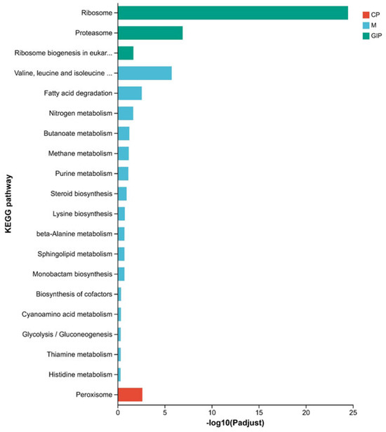 Furthermore, the primary metabolic pathways associated with DEGs were identified via KEGG pathway enrichment analysis. Figure 5 provides the top 20 enriched metabolic pathways, of which the most enrichment pathway is ribosome (Figure S73). In addition, it was found that DEGs are also significantly enriched at the proteasome (Figure S79) and ribosome biogenesis in eukaryotes pathway (Figure S77). The ribosome and proteasome pathways are associated with genetic information processing, particularly translation-related processes. Additionally, the pathways related to valine–leucine–isoleucine degradation (Figure S74), fatty acid degradation (Figure S78), and nitrogen metabolism (Figure S75) fall under metabolic processes. The pathway related to peroxisome (Figure S76) fall under cell processes. Notably, DEGs involved in nitrogen metabolism and proteasome pathways exhibited significant down-regulation. Nitrogen metabolism plays a critical role in the growth, development, reproduction, and maintenance of normal physiological functions in fungal organisms. The inhibition of the nitrogen metabolism pathway can disrupt essential biochemical processes such as amino acid and protein synthesis. Similarly, suppression of the proteasome pathway can lead to imbalances in protein metabolism, reducing stress resistance and impairing intracellular signal transduction, thereby affecting fundamental life activities like growth and reproduction in fungi. These findings indicate that compound I-12 exhibits antifungal activity by modulating nitrogen metabolism and proteasome-related biological pathways in R. solani.