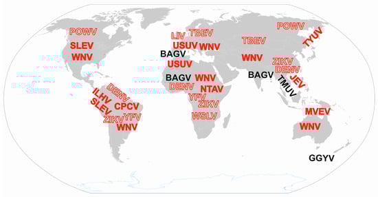 Global distribution of zoonotic orthoflaviviruses related to birds. Sporadic findings in remote locations are not indicated. Solid letters indicate viruses for which birds are the main host, while outlined letters indicate other viruses related to birds. Red highlighted viruses can cause clinical infections, while black highlighted viruses are associated with subclinical infections in humans. WNV: West Nile virus (Orthoflavivirus nilense), JEV: Japanese encephalitis virus (Orthoflavivirus japonicum), SLEV: Saint Louis encephalitis virus (Orthoflavivirus louisense), MVEV: Murray Valley encephalitis virus (Orthoflavivirus murrayense), USUV: Usutu virus (Orthoflavivirus usutuense), ILHV: Ilheus virus (Orthoflavivirus ilheusense), CPCV: Cacipacoré virus (Orthoflavivirus cacipacoreense), TYUV: Tyuleniy virus (Orthoflavivirus tyuleniyense), NTAV: Ntaya virus (Orthoflavivirus ntayaense), BAGV: Bagaza virus (Orthoflavivirus bagazaense), TMUV: Tembusu virus (Orthoflavivirus tembusu), GGYV: Gadgets Gully virus (Orthoflavivirus gadgetsense), WSLV: Wesselsbron virus (Orthoflavivirus wesselsbronense), POWV: Powassan virus (Orthoflavivirus powassanense), LIV: Louping ill virus (Orthoflavivirus loupingi), TBEV: Tick-borne encephalitis virus (Orthoflavivirus encephalitidis), DENV: Dengue virus (Orthoflavivirus dengue), YFV: Yellow fever virus (Orthoflavivirus flavi), ZIKV: Zika virus (Orthoflavivirus zika).