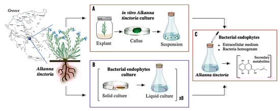 To investigate the relationship between bacterial endophytes and their host plant, co-cultures of eight different strains isolated from wild roots and in vitro cell suspension of A. tinctoria were conducted following the steps summarized in Figure 1.