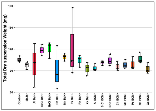 Total Dry Suspension Weight of A. tinctoria cells suspensions. BaH: bacteria homogenate; ECM: extracellular medium; Ch: Chitinophaga sp.; Xa: Xanthomonas sp.; Ps: Pseudomonas sp.; Mn: Micromonospora sp.; Al: Allorhizobium sp.; Rh: Rhizobium sp.; BrCi: Brevibacillus sp.; BrCt: Brevibacterium sp.