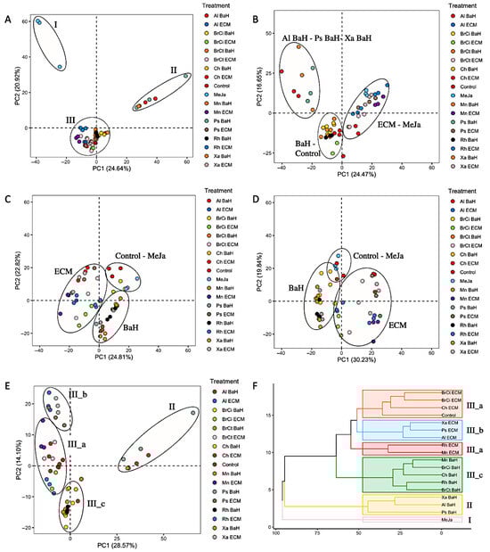 Untargeted metabolomics analysis of A. tinctoria suspensions associated with bacterial endophytes. PCA of EtoAc extract in (A) negative and (B) positive mode. PCA of EtOH in (C) negative and (D) positive mode. PCA of EtoAc extract in negative mode (E) excluding the methyl jasmonate condition. (F) Hierarchical clustering analysis of EtoAc extract in negative mode. BaH: Bacteria Homogenate; ECM: Extracellular medium; Ch: Chitinophaga sp.; Xa: Xanthomonas sp., Ps; Pseudomonas sp., Mn; Micromonospora sp., Al; Allorhizobium sp., Rh; Rhizobium sp., BrCi; Brevibacillus sp., BrCt; Brevibacterium sp.