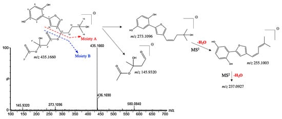 Compound 5 presented a pseudo molecular [M−H]− ion at m/z 435.1660 and shared a similar MS/MS fragmentation pattern with compounds 10 and 27, tentatively assigned as hydroxyshikonofuran. Compounds 10 and 27 have been previously identified by Liao et al. by the extensive use of MS and MS/MS spectra [26]. Indeed, the MS/MS spectra of compound 5 shows ions at m/z 273.1096, resulting from a McLafferty rearrangement in moiety A (Figure 4). In addition, the characteristic second-generation product ions at m/z 255.1003 and at 237.0927 were obtained from the successive neutral loss of H2O of the moiety A (Figure 4). The RCOO−, obtained from moiety B at m/z 145.9320, was deduced from the hydroxyshikonofuran H described by Liao et al. Therefore, compound 5 was tentatively assigned as a 3′-hydroxy-14-hydroxyshikonofuran H with a chemical formula of C22H28O9.