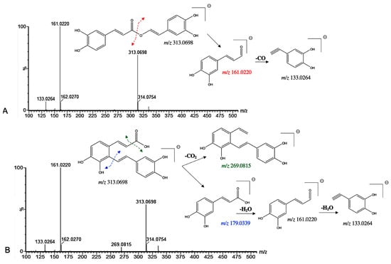 Among the induced ions, two C6-C3 dimeric forms with a pseudo molecular [M−H]− ion at m/z 313 were identified. Compound 18 presented a pseudo molecular [M−H]− ion at m/z 313.0698 and prominent ion fragments at m/z 161.0220 and 133.0264 (Figure 5). Interestingly, a similar fragmentation pattern has been found for the rosmarinic acid [31]. However, a mass difference of 46 Da between compound 18 and the well-known rosmarinic acid was assigned. In particular, the lack of the fragment ion at m/z 197.0448 suggested the absence of the carboxyl group at C-8′ in the structure (Figure 5). Therefore, compound 18 was tentatively assigned as an 8′-decarboxy-rosmarinic acid with a chemical formula of C17H14O6. Similarly, compound 22 presented a pseudo molecular [M−H]− ion at m/z 313.0698 and prominent ion fragments at m/z 161.0220 and 133.0264 (Figure 5). However, the presence of an additional fragment ion at m/z 269.0815 indicated that the structure may be different. Indeed, compound 22 has been previously identified by Grzegorczyk-Karolak et al. by the extensive use of MS and MS/MS spectra as salvianolic acid F [30].