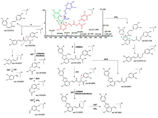 In addition to the dimeric C6-C3 forms, two new tetramers were tentatively identified. Compound 23 presented a pseudo molecular [M−H]− ion at m/z 671.1400 and prominent ion fragments at m/z 625.1328, 521.1053, 445.0915, 359.0759, 313.0711, 267.0643, and 161.0237 (Figure 6). The fragment ion at m/z 359.0773, resulting from the cleavage a of the hydroxybenzofuran ring, correspond to a rosmarinic acid unit [30]. The MS/MS spectra show the characteristic second-generation product ions at m/z 197.0426, 179.0339, and 135.0445, resulting from the three consecutive losses of danshensu (C9H10O5), H2O and CO2. Thus, this confirmed the existence of two C6-C3 units in the structure of compound 23 (part red; Figure 6). The fragment ion at m/z 521.1053 emerged from the cleavage b and produced two fragment ions at m/z 491.0892 and 445.0915, resulting from the loss of one or two CO, respectively. The MS/MS spectra show diagnostic fragments at m/z 311.0555 and 267.0643, resulting from the consecutive losses of dehydroxydanshensu (C9H8O4) and CO2. This clearly suggested the presence of a dihydroxy benzene hydroxybenzofuran on the structure, and thus, a third C6-C3 unit (part green; Figure 6). Interestingly, a similar fragmentation pattern has been found for the salvianolic acid B [31]. However, a mass difference of 46 Da with respect to salvianolic acid B was assigned. In particular, the diagnostic MS/MS fragments at m/z 625.1328 and 313.0711 suggested the absence of the carboxyl group at C-8‴ (part blue; Figure 6). Therefore, compound 23 was tentatively assigned as an 8‴-decarboxy-salvianolic acid B with a chemical formula of C35H28O14.