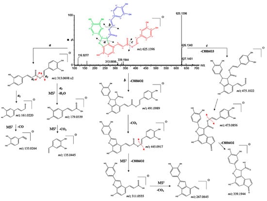Furthermore, compound 26 was identified as a new tetramer. It presented a pseudo molecular [M−H]− ion at m/z 625.1328 and prominent ion fragments at m/z 491.0989, 445.0917, 313.0698, 179.0939, and 161.0220 (Figure 7). Interestingly, its pseudo molecular ion correspond to one of the fragment ions of compound 23, corresponding to a neutral loss of a carboxyl group at position C-8″. Our suggestion was further confirmed by the diagnostic fragments at m/z 475.1022, 473.0856 and 339.1944, resulting in a McLafferty rearrangement [29]. Therefore, compound 26 was tentatively assigned as an 8″-8‴-didecarboxy-salvianolic acid B with a chemical formula of C34H26O12.