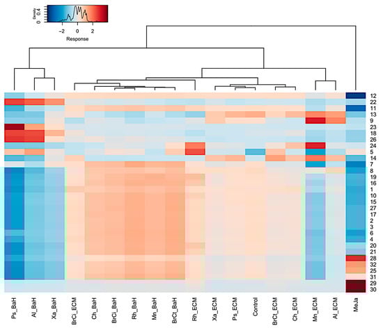 Interestingly, the effect of other bacteria homogenates (i.e., Chitinophaga sp., Brevibacterium sp., Brevibacillus sp., Micromonospora sp.) was less targeted towards the induction of particular metabolites but instead activated the plant’s general metabolic response. Conversely to these treatments, the inoculation with Rhizobium sp. extracellular medium involved mostly the induction of compound 5, 3′ hydroxy-14-hydroxyshikonofuran H. This highlighted the ability of the bacteria to stimulate the production of specific metabolites.