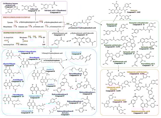 Twenty-six phenolic compounds belonging to different chemical groups were tentatively characterized. Among them, eleven peaks were annotated as phenolic acid in Danshen (root or rhizome of Salvia miltiorrhiza Bunge) [23], made up of several monomers like danshensu and caffeic acid. Seven dimers, one trimer, and four tetramers, including two newly identified compounds, were identified. In addition, fifteen phenolic compounds derived from the geranylhydroquinone were detected such as one echinofuran, five hydroxyshikonofurans, and nine hydroxynaphthoquinones.