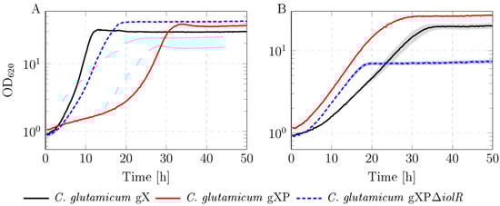 Growth analysis of the strains C. glutamicum gX, C. glutamicum gXP, and C. glutamicum gXPΔiolR in (A) modified CgXII medium supplemented with 40 g L−1 glucose and (B) modified CgXII medium supplemented with 40 g L−1 xylose. Strain screening was performed in a BioLector micro-cultivation system. Data represent means of 3 replicates with standard deviations as error bands (shaded areas).
