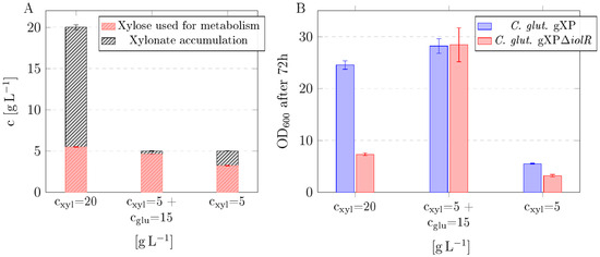 The oxidation of xylose to xylonic acid (xylonate) and the accumulation thereof in C. glutamicum ΔiolR was previously shown [19]. To investigate the effect of substrate composition on xylose metabolism and xylonate formation in C. glutamicum gXPΔiolR, cultures were supplemented with either two different concentrations of xylose alone or a mixture of xylose and glucose. The resulting concentrations of xylose, accumulated xylonate, and net growth after 72 h of cultivation are presented in Figure 2. In cultures with a high xylose concentration of 20 g L−1, a substantial portion of the substrate was diverted towards xylonate accumulation, with only around 27% of the xylose utilized for metabolic purposes (Figure 2A). In contrast, the mixed substrate condition (5 g L−1 xylose + 15 g L−1 glucose) resulted in negligible xylonate accumulation, with almost all xylose channeled into metabolism. Interestingly, cultures grown with a low xylose of 5 g L−1 as the sole carbon source showed a moderate xylonate accumulation of around 1.5 g L−1, with the remaining xylose (around 65%) used for metabolism. For investigating the substrate conversion efficiency of C. glutamicum gXPΔiolR, growth was compared with C. glutamicum gXP (Figure 2B). C. glutamicum gXPΔiolR metabolized the largest fraction of xylose (>93%) under mixed substrate conditions and showed comparable biomass production to C. glutamicum gXP. The supply of high xylose concentrations resulted in inefficient substrate utilization and maximal xylonate overflow (Figure 2A,B) in C. glutamicum gXPΔiolR. A low xylose concentration without co-feeding of glucose led to a moderate metabolic efficiency in C. glutamicum gXPΔiolR (Figure 2A,B). In summary, a very high xylose supply triggered xylonate accumulation, while glucose co-feeding promoted efficient xylose utilization.
