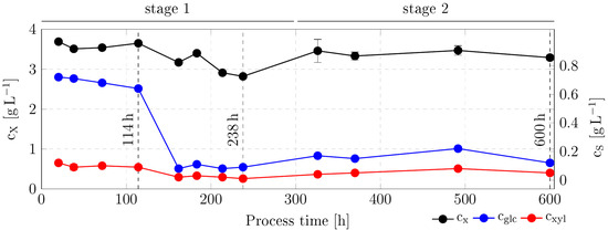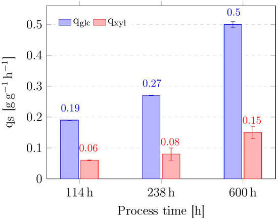 To evaluate changes in substrate uptake, biomass-specific uptake rates of glucose and xylose were calculated for relevant time points (Figure 4). Within the first stage of the process, between 114 and 238 h of continuous ALE, the biomass-specific uptake rates for glucose (qglc) and xylose (qxyl) increased by 42% and 33%, respectively. In stage 2 (600 h), qglc and qxyl increased further by 85% and 88%, respectively. In other words, qglc and qxyl raised 2.6- and 2.5-fold compared with the initial status. Surprisingly, the ratio between the biomass-specific xylose and glucose uptake rates did not change, but leveled at around 0.3 for all quantification time points.