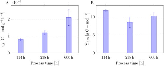To study metabolic changes, biomass-specific carbon uptake rates and substrate-to-biomass yields were calculated on a molar basis (Figure 5A,B). During ALE, the biomass-specific molar carbon uptake rate of C. glutamicum gXPΔiolR increased from 0.008 ± 0.001 C-mol g−1 h−1 to 0.021 ± 0.005 C-mol g−1 h−1. The biomass substrate yield decreased from 11.81 ± 0.22 g C-mol−1 to 8.55 ± 1.48 g C-mol−1 in the first stage of the process, but was nearly restored within the second stage of the process and amounted to 10.26 ± 0.89 g C-mol−1 after 600 h of cultivation (Figure 5B).