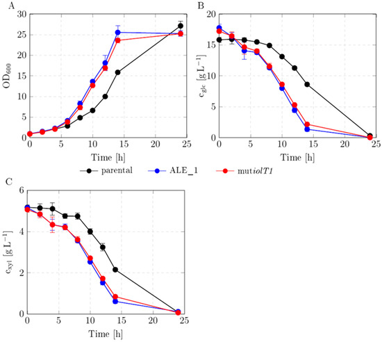 To evaluate and verify the phenotypic effect, the mutation IolT1A452P was reverse-engineered into the parental background C. glutamicum gXPΔiolR. The resulting strain C. glutamicum gXPΔiolRmutiolT1 (also referred to as mutiolT1) was benchmarked against ALE_1 and the parental background strain regarding growth rate and sugar uptake rates in modified CgXII medium supplemented with glucose and xylose. The reverse-engineered strain C. glutamicum gXPΔiolRmutiolT1 exhibited growth kinetics and sugar uptake kinetics comparable to ALE_1 (Figure 6 and Table 4). The kinetic parameters for each of the three strains were calculated and are listed in Table 4. The parental strain exhibited a growth rate μ of 0.20 ± 0.00 h−1, whereas both the ALE_1 and the mutiolT1 strain were characterized by significantly increased (p ≤ 0.001) growth rates of 0.27 ± 0.01 h−1, an increase of 35%. The glucose uptake rate (qglc) of mutiolT1 significantly increased by 83% (p ≤ 0.001), and xylose consumption (qxyl) was 20% (p ≤ 0.05) higher compared with the parental background. Both the evolved strain ALE_1 and the reverse-engineered strain C. glutamicum gXPΔiolR mutiolT1 showed similar growth and substrate uptake kinetics, highlighting the phenotypic effect on metabolism by this single mutation.