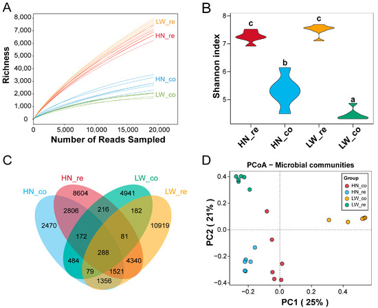 Microbial diversity and community structure in rectal and colonic contents. (A) Rarefaction curves showing operational taxonomic units (OTUs) richness across rectal (re) and colonic (co) samples from HN and LW pigs. (B) Shannon index of gut microbial communities in HN and LW pigs. Bars labeled with different lowercase letters indicate significant differences (p < 0.05) between group. (C) Venn diagram of unique OTUs among groups. (D) Principal coordinates analysis (PCoA) based on Bray–Curtis distance showing clear separation of microbial communities by both breed and intestinal segment.