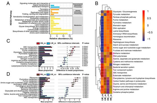 Functional prediction of gut microbiota based on KEGG pathways. (A) Relative abundance of KEGG level 2 functional categories across all samples. Pathways are grouped into three major categories: metabolism (yellow), genetic information processing (brown), and environmental information processing (blue). (B) Heatmap of representative KEGG pathways illustrating functional enrichment differences among groups. Values indicate normalized pathway scores, with warmer colors representing higher enrichment. (C) Comparison of predicted functional pathways between HN and LW pigs in rectal samples (HN_re vs. LW_re). The left panel shows the mean proportions of selected pathways; the right panel shows differences with 95% confidence intervals and associated p-values (Wilcoxon rank-sum test). (D) Functional pathway comparison in colonic samples (HN_co vs. LW_co), with visualization formats identical to (C).