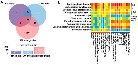 Metabolomic analysis was performed using intestinal digesta samples collected from the rectum and colon. Metabolites were extracted using a pre-cooled methanol-water solution (4:1 v/v, 500 μL per 100 mg tissue) containing internal standards [e.g., L-2-chlorophenylalanine (10 μM) and deuterated glucose (d7-glucose, 50 μM)]. After vortexing for 2 min, ultrasonic disruption (ice bath, 15 min), and low-temperature centrifugation (14,000× g, 4 °C, 20 min), supernatants were collected and lyophilized under vacuum. Prior to LC-MS analysis, lyophilized metabolites were reconstituted in 10% methanol solution (100 μL). For quality control (QC), pooled samples were prepared by combining equal aliquots of all biological extracts, and solvent blanks were included to monitor background interference. QC samples were processed alongside experimental samples and injected every 10 samples to assess analytical reproducibility. Ultra-high-performance liquid chromatography (UHPLC) separation was performed using a Vanquish UHPLC system equipped with a Hypesil Gold column (1.9 µm, 2.1 × 100 mm), coupled with a Q Exactive™ HF-X mass spectrometer (Waltham, MA USA). Data-independent acquisition (DIA) was employed to collect mass spectrometry data in both positive and negative ion modes. Progenesis QI v2.3 software was used for metabolite feature detection, alignment, and normalization. Orthogonal partial least squares discriminant analysis (OPLS-DA) was performed using metaX v1.0 to optimize group separation and identify differentially expressed metabolites (DEMs) between HN and LW groups. For feature detection, parameters were set as follows: retention-time tolerance of 0.2 min and mass tolerance of 5 ppm. Metabolites with variable importance in projection (VIP) ≥ 1, p < 0.05 (Wilcoxon rank-sum test), and |log2FC| ≥ 1 were considered significantly different. Data normalization was performed using total ion current (TIC) normalization, and missing values were imputed with the minimum value plus 10% of the standard deviation for each feature. For OPLS-DA, a 7-fold cross-validation strategy was applied, and permutation tests (200 permutations) were conducted to assess model validity, yielding a permutation p-value of 0.01 and R2Y intercept of 0.12, Q2 intercept of −0.35. KEGG and Human Metabolome Database (HMDB) were used for metabolic pathway enrichment analysis.