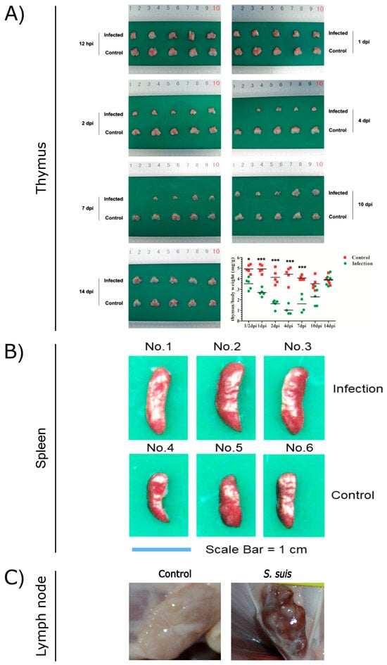 Pathological observations of thymus (A), spleen (B), and lymph nodes (C) from S. suis-infected and control pigs. (A) Reproduced from Reference [] (https://doi.org/10.1128/iai.00950-19), *, p < 0.05; ***, p < 0.001; (B) reproduced from Reference [] (https://doi.org/10.1128/spectrum.03210-22); (C) reproduced from Reference [] (https://doi.org/10.3389/fmicb.2023.1159590).