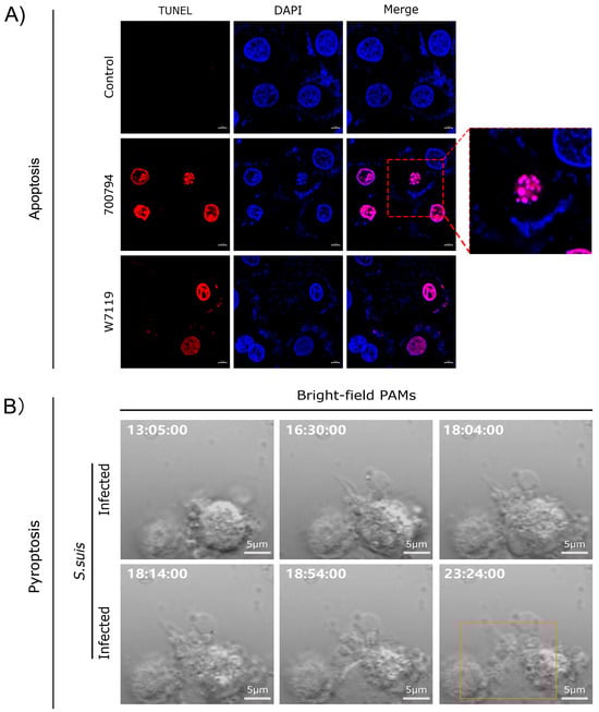 Analysis of apoptosis and pyroptosis in macrophages infected with S. suis. (A) Reproduced from Reference [] (https://doi.org/10.3390/microorganisms11010160); (B) reproduced from Reference [] (https://doi.org/10.3390/microorganisms12091879), orange rectangle indicate pyrolyzed cells.