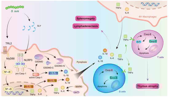 The study conducted by Wang et al. also revealed that S. suis triggered apoptosis in B cells of infected spleens of mice []. In the spleens of infected mice, caspase-8 was upregulated and there was no significant change in caspase-9 and CytC, indicating that the extrinsic caspase pathway contributed to S. suis-induced splenocytes apoptosis. H. Gou et al. demonstrated that CSFV infection induced apoptosis in the spleen, mechanistically linked to lymphocyte depletion. Western blot revealed that the level of cleaved caspase-3 in CSFV-infected splenocytes increased, accompanied by concurrent activation of both caspase-8 and caspase-9, which indicated synergistic engagement of extrinsic and intrinsic apoptosis pathways []. S. suis could induce the cleavage of pro-caspase-1 and gasdermin D (GSDMD) and increase the expression of IL-1β and IL-18 in spleens of infected mice, which suggests that S. suis caused pyroptosis in splenocytes []. Pyroptosis occurs via the NOD-like Receptor Pyrin domain-containing 3 (NLRP3) inflammasome pathway, involving the activation of caspase-1 and the cleavage of GSDMD. Studies have demonstrated that high expression of suilysin in S. suis is closely associated with the activation of the NLRP3 inflammasome [,,], and the membrane-perforating activity of suilysin plays a critical role in inducing high levels of NLRP3 inflammasome activation []. Thus, suilysin may be an important factor causing splenomegaly in S. suis-infected spleens.