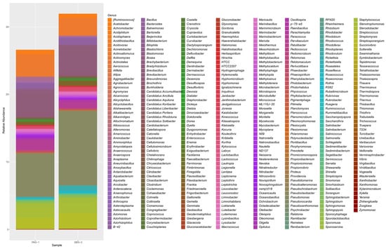 Genomic DNA was extracted using a conventional Phenol Chloroform method [,] and used as a template for PCR amplification of the V3–V4 region of the 16S rRNA gene using gene-specific primers 341F (CCTAYGGGRBGCASCAG) and 806R (GGACTACNNGGGTATCTAAT). PCR amplification was performed with incubation at 98 °C for 1 min, followed by 30 cycles of incubation at 98 °C (10 s), 57 °C (30 s), and 72 °C (1 min), with a final extension cycle of 5 min at 72 °C []. The amplicons obtained from the PCR reaction were purified and checked with the Bioanalyzer 2100 (Agilent Technologies, Santa Clara, CA, USA). Libraries were prepared using the TruSeq DNA PCR-Free Library Preparation Kit (Illumina, San Diego, CA, USA). The prepared libraries were quantified using a Qubit 4 fluorometer (Thermo Fisher Scientific, Waltham, MA, USA) and Quant Studio 5 real-time PCR (Applied Biosystems, Waltham, MA, USA). The qualified libraries were sequenced using paired-end chemistry on the NovaSeq 6000 platform (Illumina, USA) with a read length of 250 bp.